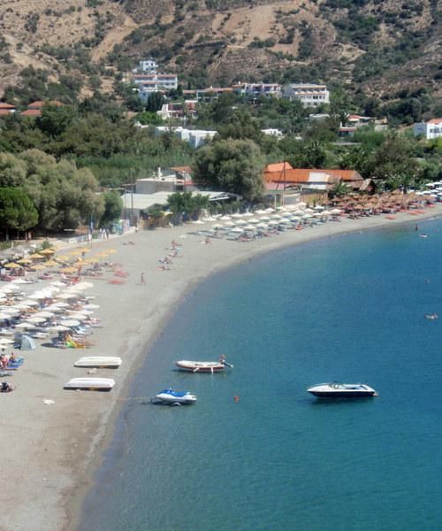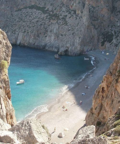 The gorge (30 minutes walking) ends at a beach surrounded by tall, imposing rocks. It is a unique beauty, secluded beach with fine pebbles and deep, crystal clear waters.Access to it, either through the gorge or by boat from Kali Limenes, Matala and Agia Galini. Around 250 meters before the beach is the temple of Agios Antonios, built in the 14th century and next to it a well . Also, on the rocks, to the left of the church, is formed a huge cave, Goumospilio, which is illuminated inside by a hole on the roof and was the meeting place of the ascites of the area, once a year. The beach is about 15 km from the houses.