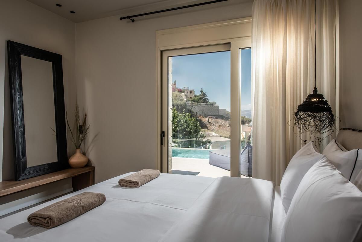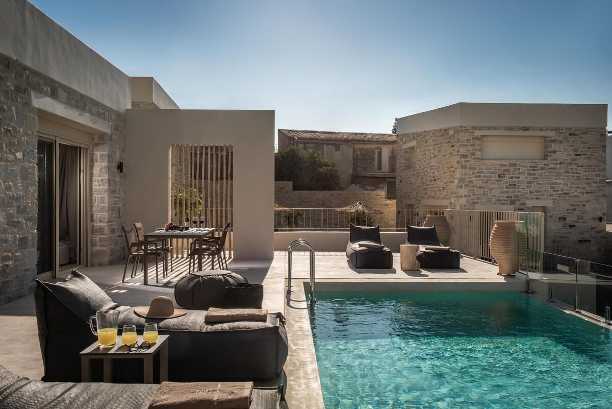 Guests are able to enjoy moments of happiness and relaxation in the large balcony and the private pool with the breathtaking view on the Messara Plateau, Faistos Palace and Psiloritis Mountain. Balcony is equipped with a table and sunbeds.